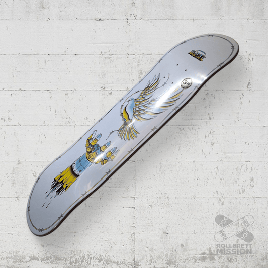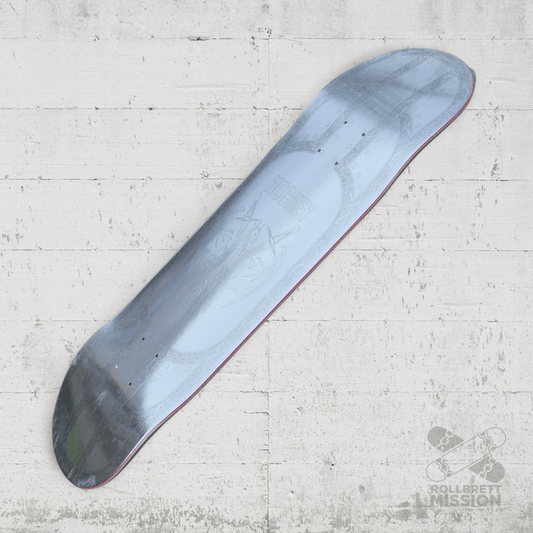 Bei Rollbrett Mission erhältst du Skateboard Decks in unterschiedlichen Breiten und Shapes zu fairen Preisen. Die Boards sind, wenn nicht anders angegeben, in der klassischen 7-Ply-Konstruktion aus kanadischem Bergahorn gefertigt. Wir schenken dir zu jedem Deck eine Lage schwarzes Griptape dazu. Gegen Aufpreis kannst du auch anderes Griptape von verschiedenen Marken in diversen Farben und Designs zu deinem Brett haben. Wenn du dein Griptape professionell aufgezogen haben möchtest, gib dies bitte als Kommentar im Warenkorb mit an. Wir ziehen dein Griptape gerne gratis für dich auf, dieser Service kostet bei uns nichts! Unsere Eigenmarke Rollbrett Mission Skateboards kommt aus einem international renommierten Woodshop, der auch für andere große Marken produziert. Unser Team ist von der Qualität und dem Shape absolut überzeugt! Neben dem klassischen Popsicle-Shape haben wir auch Decks in Oldschool-Shape, Pool-Shape oder Eggshape, auch Football Shape genannt. Der Rollbrett Mission Skateshop führt neben der Eigenmarke auch Decks von vielen anderen Brands wie z.B. Real, Toy Machine, Anti Hero, Foundation, Inpeddo, Alien Workshop, Ocean und viele weitere Skateboardmarken. Wir haben im Shop immer günstige Angebote an Skateboard Decks für Einsteiger oder langjährige Skater. Gerne bestellen wir dein Wunsch-Deck für dich nach und beraten dich jederzeit gerne. Die Deckbreite z.B. ist absolut Geschmackssache, da hat sich der Trend in den letzten Jahren wieder in Richtung breiter entwickelt. Der Durchschnitt bei erwachsenen Skatern liegt für Street und Park momentan bei 8.25 Inch (Zoll), was ca. 21cm Breite entspricht. Kinderboards sind schmäler und beginnen bei ca. 7.25 bis 8 Zoll. Aber auch Bretter von 8.5 bis über 9 Zoll sind immer beliebter. Skateboards werden traditionell in Zoll gemessen. Wir geben im Normalfall auch immer die Länge des Skateboard Decks und die Wheelbase mit an.