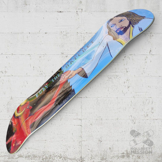 Bei Rollbrett Mission erhältst du Skateboard Decks in unterschiedlichen Breiten und Shapes zu fairen Preisen. Die Boards sind, wenn nicht anders angegeben, in der klassischen 7-Ply-Konstruktion aus kanadischem Bergahorn gefertigt. Wir schenken dir zu jedem Deck eine Lage schwarzes Griptape dazu. Gegen Aufpreis kannst du auch anderes Griptape von verschiedenen Marken in diversen Farben und Designs zu deinem Brett haben. Wenn du dein Griptape professionell aufgezogen haben möchtest, gib dies bitte als Kommentar im Warenkorb mit an. Wir ziehen dein Griptape gerne gratis für dich auf, dieser Service kostet bei uns nichts! Unsere Eigenmarke Rollbrett Mission Skateboards kommt aus einem international renommierten Woodshop, der auch für andere große Marken produziert. Unser Team ist von der Qualität und dem Shape absolut überzeugt! Neben dem klassischen Popsicle-Shape haben wir auch Decks in Oldschool-Shape, Pool-Shape oder Eggshape, auch Football Shape genannt. Der Rollbrett Mission Skateshop führt neben der Eigenmarke auch Decks von vielen anderen Brands wie z.B. Real, Toy Machine, Anti Hero, Foundation, Inpeddo, Alien Workshop, Ocean und viele weitere Skateboardmarken. Wir haben im Shop immer günstige Angebote an Skateboard Decks für Einsteiger oder langjährige Skater. Gerne bestellen wir dein Wunsch-Deck für dich nach und beraten dich jederzeit gerne. Die Deckbreite z.B. ist absolut Geschmackssache, da hat sich der Trend in den letzten Jahren wieder in Richtung breiter entwickelt. Der Durchschnitt bei erwachsenen Skatern liegt für Street und Park momentan bei 8.25 Inch (Zoll), was ca. 21cm Breite entspricht. Kinderboards sind schmäler und beginnen bei ca. 7.25 bis 8 Zoll. Aber auch Bretter von 8.5 bis über 9 Zoll sind immer beliebter. Skateboards werden traditionell in Zoll gemessen. Wir geben im Normalfall auch immer die Länge des Skateboard Decks und die Wheelbase mit an.