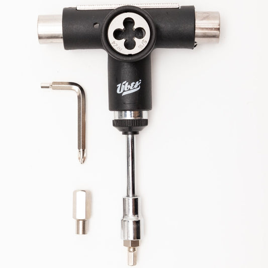 Die speziell für Skateboards abgestimmten Werkzeuge sollte man bei jeder Session dabei haben. Schnell hat sich mal eine Schraube gelöst oder man will die Lenkung einstellen. Teilweise haben die Tools auch einen eingebauten Gewindeschneider für den Achsstift. Achtung, bei Skateboard-Teilen wird traditionell das US-System mit Zollgrößen verwendet, daher passen die Schlüssel aus Mamas Werkzeugkasten nur grob! Achsstift 1/2" ist ungefähr 13mm, Kingpin 9/16" etwa 14mm, Montagemuttern 3/8" etwa 10mm.